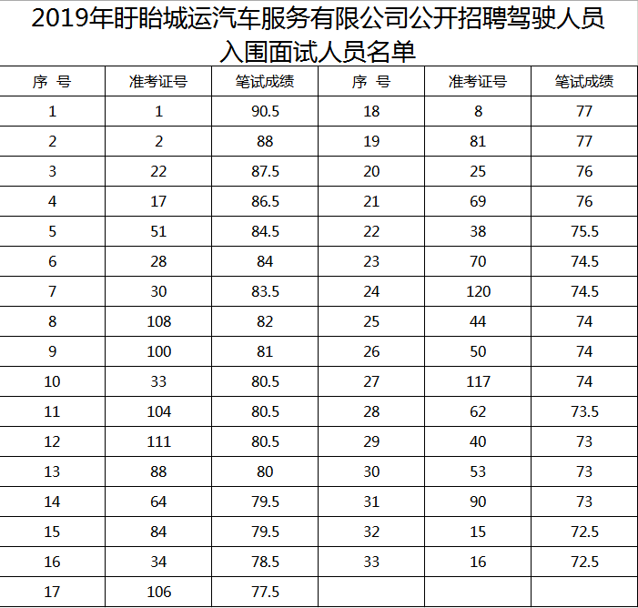 2019年盱眙城運(yùn)汽車服務(wù)有限公司公開招聘駕駛?cè)藛T筆試已于2019年9月10日結(jié)束,考生的筆試成績(jī)已經(jīng)公布。根據(jù)《盱眙城運(yùn)汽車服務(wù)有限公司駕駛員招聘簡(jiǎn)章》規(guī)定,現(xiàn)將入圍面試人員名單予以公布。面試具體時(shí)間及地點(diǎn)另行通知。??